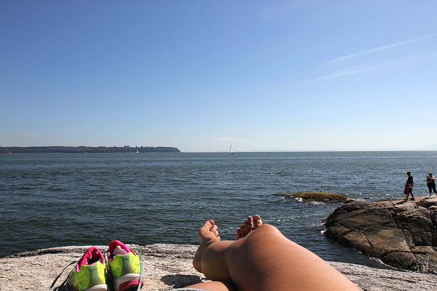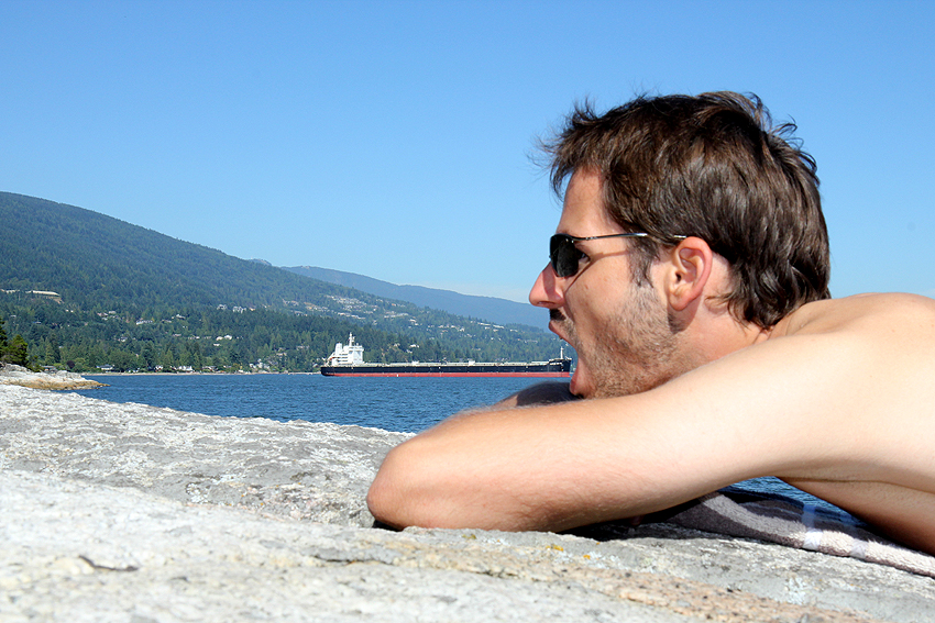 Anna genießt die Sonne, während Marcel einen Tanker verdrückt. [Lighthouse Park, West Vancouver] |