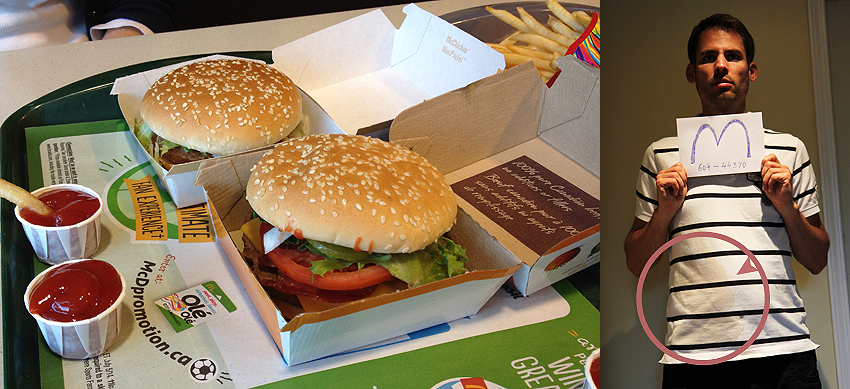 Besuch beim Quälfleischverkäufer Mäckes nach langer Zeit der überwiegenden Fastfood- und Fleischverweigerung. Dieser Bruch wurde umgehend bestraft - Marcel war nicht mehr Herr über seine motorischen Fähigkeiten und kippte den halben Liter Cola über sich und flutete damit fast den ganzen Laden. Ein mehr als eindeutiges Zeichnen und die späte Rache des Tieres. [McDonalds, North Vancouver] |