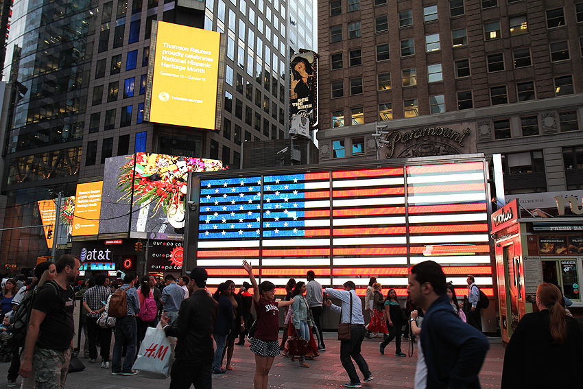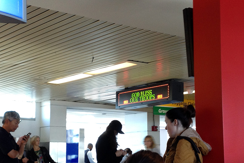 Und da ist es wieder. Am Flughafen wird einem alle 50 Meter dieser Stuss eingetrichtert. Natürlich immer im Wechsel mit den Terminen der Flughafenkapelle, damit man auch gleich höchst persönlich für die armen, geschundenen eigenen Soldaten (die tatsächlich zu bedauern sind, weil sie doch wirklich denken, sie würden sich immer noch für den 11. September rächen und für das Gute in der Welt kämpfen) beten kann, dass diese fleißig die Bösen wegbomben mögen. Nun denn, wir fliegen heute nach Toronto und freuen uns auf die schon am Flughafen merkbar freundlicheren Kanadier. :-) [New York City, NY] |